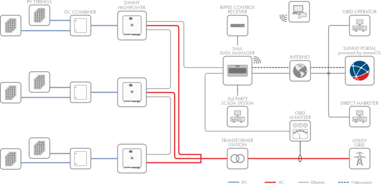 Każde z urządzeń można sterować bezpośrednio poprzez niezawodną, szybką komunikację ethernetową między Data Manager a falownikiem. Monitorowanie kompletu instalacji odbywa się centralnie z poziomu nowego Sunny Portal powered by ennexOS. Istnieje również możliwość prostej zmiany konfiguracji różnych instalacji, bez konieczności użycia wielu połączeń VPN. Dodatkowe systemy monitorowania mogą uzyskiwać dostęp do wszystkich urządzeń za pośrednictwem otwartych interfejsów Modbus/TCP systemu.