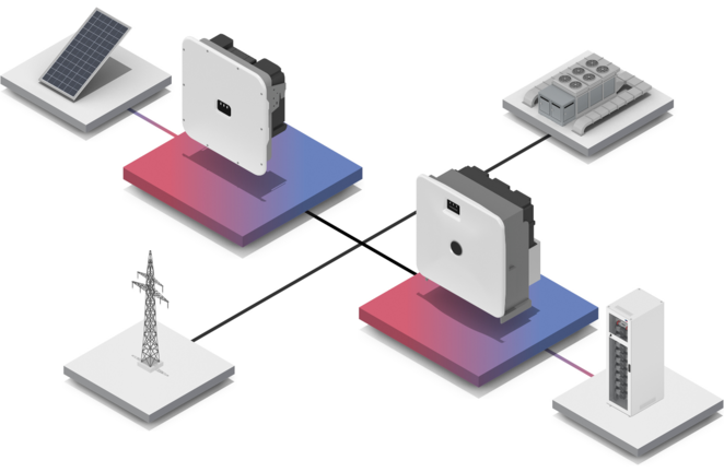 - Rozszerzenie lub zmodyfikowanie systemu fotowoltaicznego za pomocą falownika hybrydowego. Łączy on funkcje falownika fotowoltaicznego i inwertera akumulatorowego w jednym urządzeniu.
