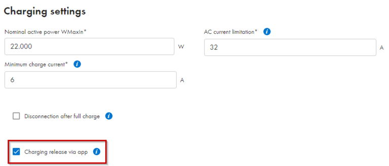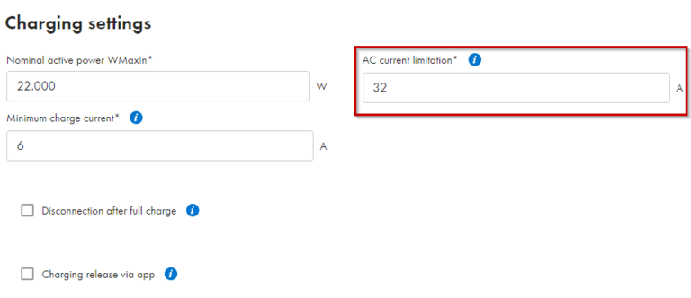 Fabryczna wartość minimalna prądu ładowania to 6 A (zgodnie z normą IEC 61851-1). W zależności od podłączonego pojazdu może być konieczne dostosowanie tej wartości. Renault ZOE z uwagi na wewnętrzny układ elektroniczny ładowania może ładować się bezproblemowo dopiero od prądu ładowania na poziomie 10 A. W takim wypadku należy skontaktować się z producentem pojazdu i ustalić minimalny prąd ładowania. Dostosowanie tej wartości ma wpływ na rozpoczęcie ładowania oraz wartość progową przełączenia funkcji automatycznego przełączania faz.